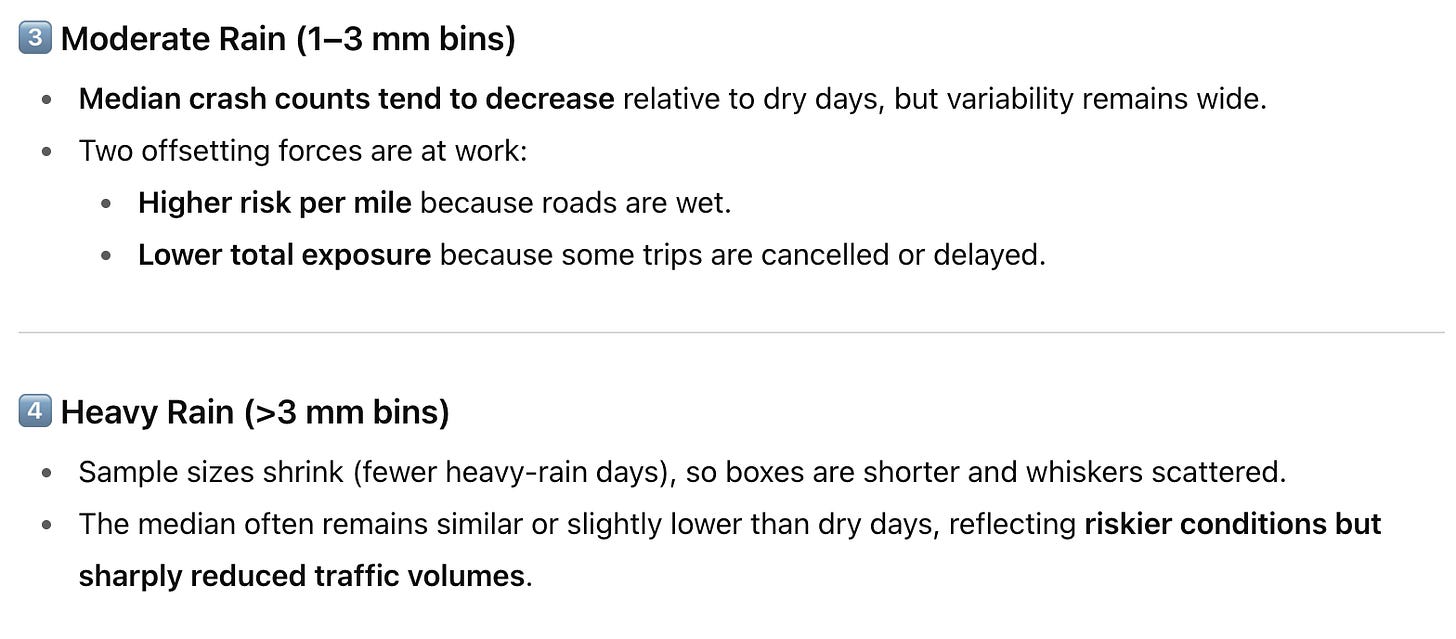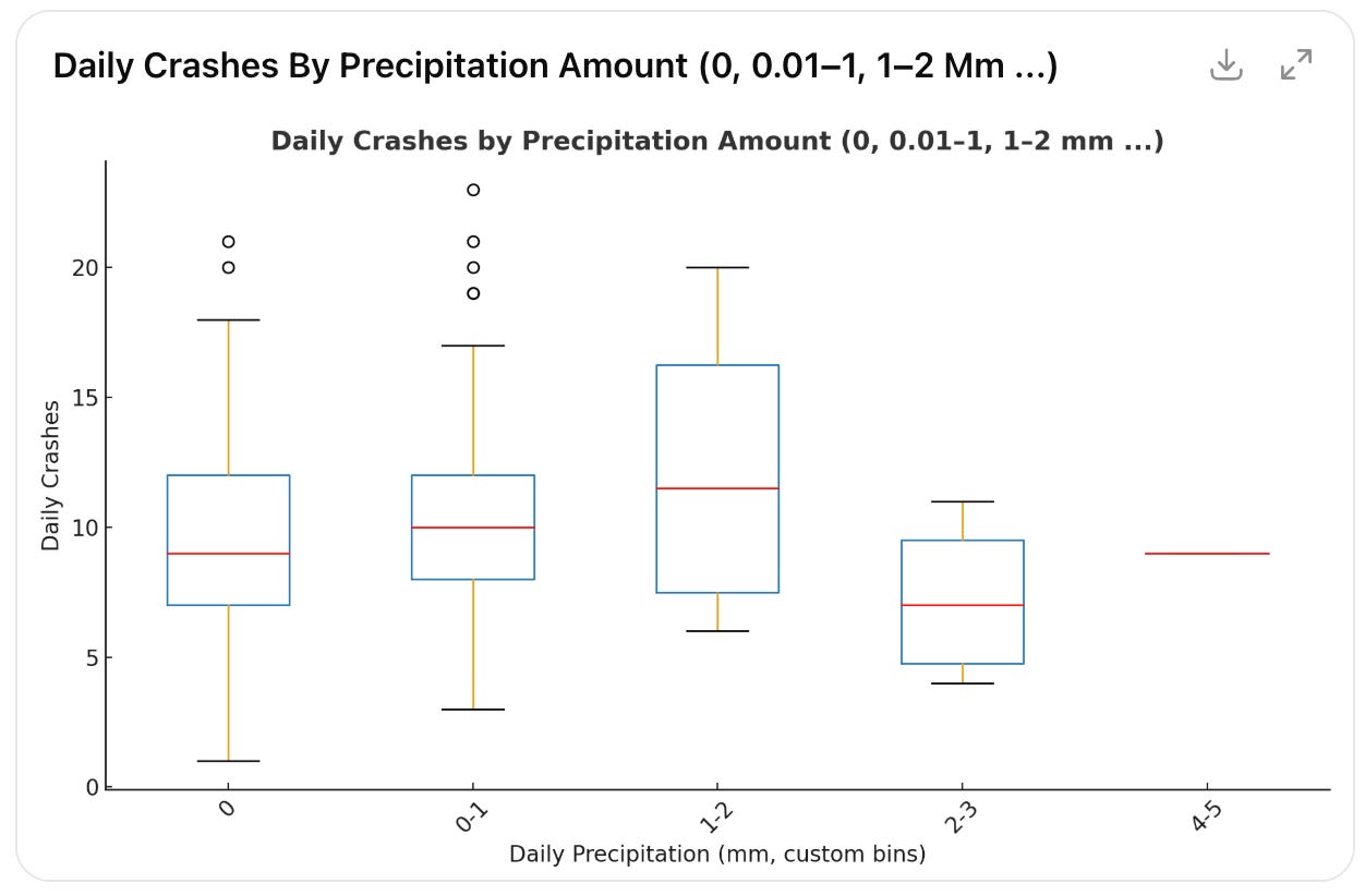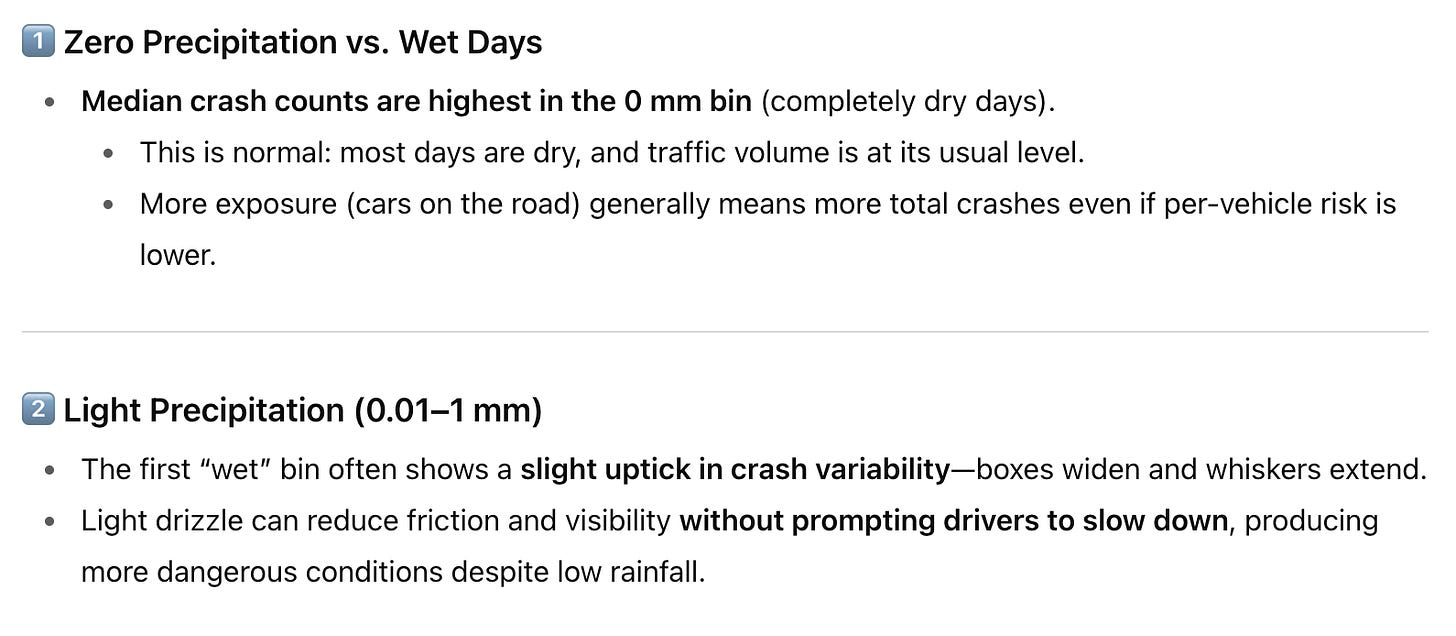 LLMs bring a completely new element to the data analyst toolkit: a machine that can provide interpretations of the generated output. When a new chart is generated, you can ask ChatGPT to explain what the graph shows and why a certain relationship exists. Now, the results can be wildly inaccurate, but this is not the point. By providing you with some kind of reasoning, it can help you think about potential causes for effects that you observe. Here is a good example of this idea. I created a box plot showing the relationship between precipitation and the number of crashes. If you are not careful, you may expect that the number of crashes increases with the precipitation amount, but this is what the chart looks like: