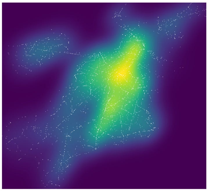 At some point during my analysis, I wanted to produce a heat map showing how collisions are distributed spatially. I knew that I had to ask it to produce a distribution using Kernel Density Estimation (KDE) (a statistical method to generate a continuous distribution from discrete data points), but I could not recall what parameters I had to set to produce the image I wanted. The first result did not have enough details (the one on the right), and I knew the problem was in the KDE settings.