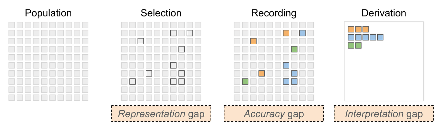 Every data set draws items from the population through some selection mechanism, which may be more or less explicit. The way this selection is made has a huge impact on what inferences we can draw from the data. Aside from the obvious fact that measuring anything from a subset introduces some uncertainty regarding the accuracy of a given value, the procedures used to derive a dataset can also introduce significant distortions and gaps between what we think the data represents and what it actually represents. In other words, if we are not aware of the difference between what we aim to study and what the data contains, we can easily be led astray. If a mismatch exists between the idealized population and the data, we have what I call a “Representation Gap,” which is the situation where the data does not accurately represent what we assume it does.