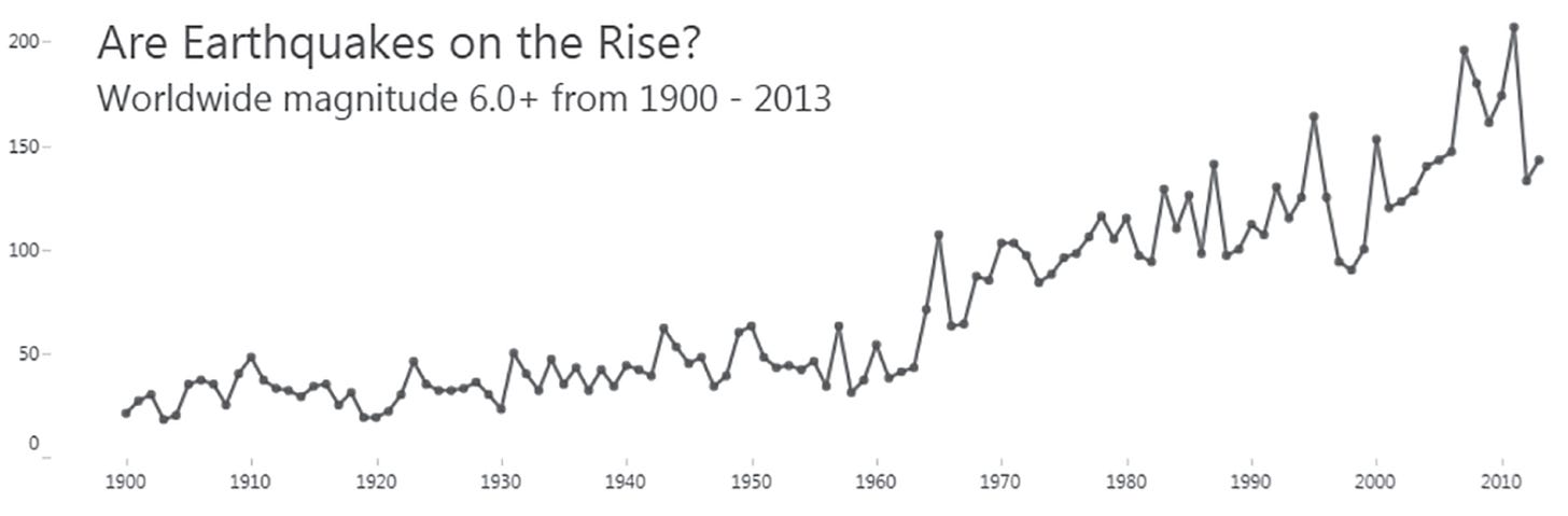 Earthquakes are not really on the rise. What changed is the precision of the instruments used to detect the earthquakes, causing this apparent upward trend. If one is not careful about consistency, apparent trends can easily lead to faulty interpretations.
